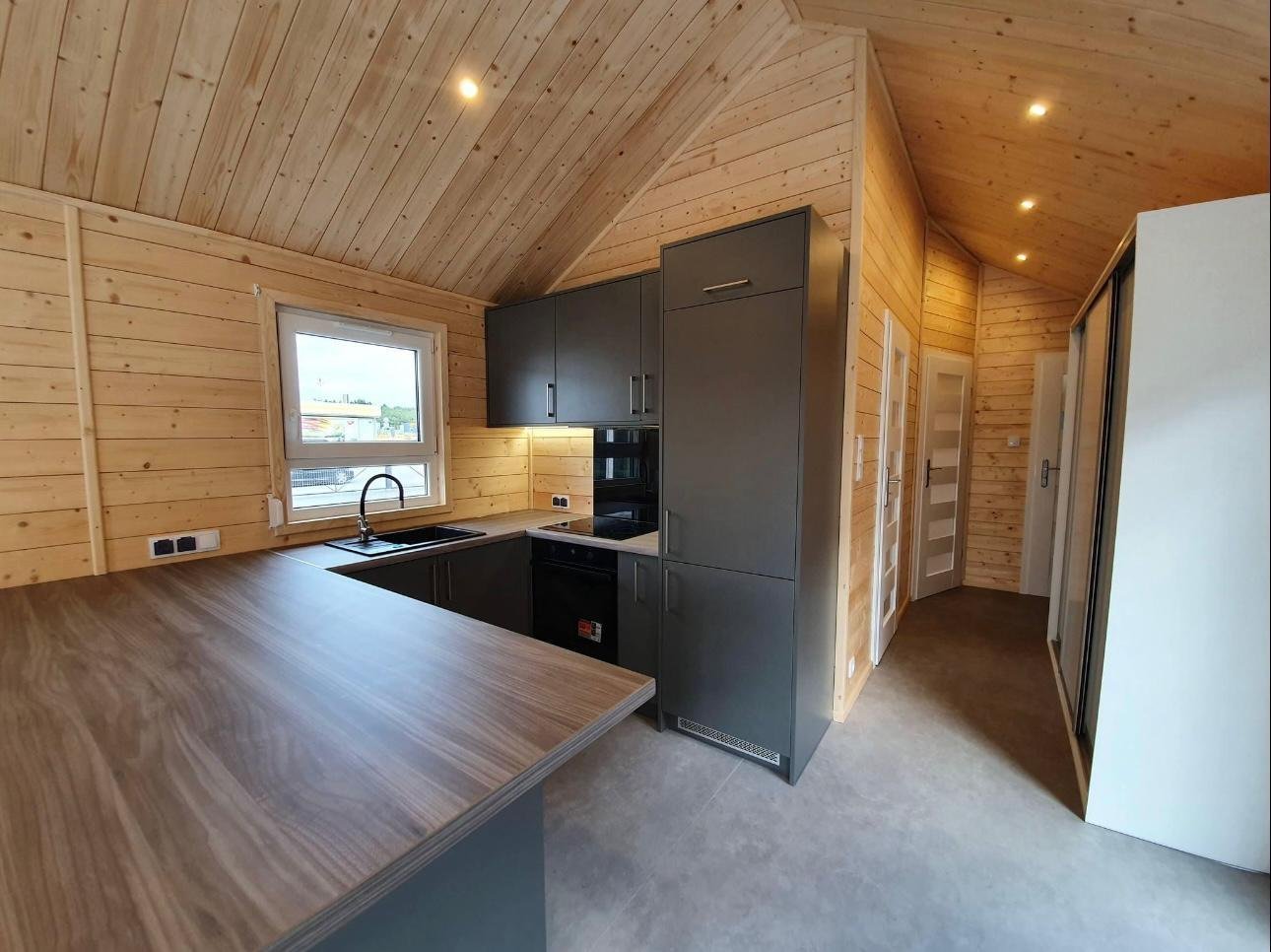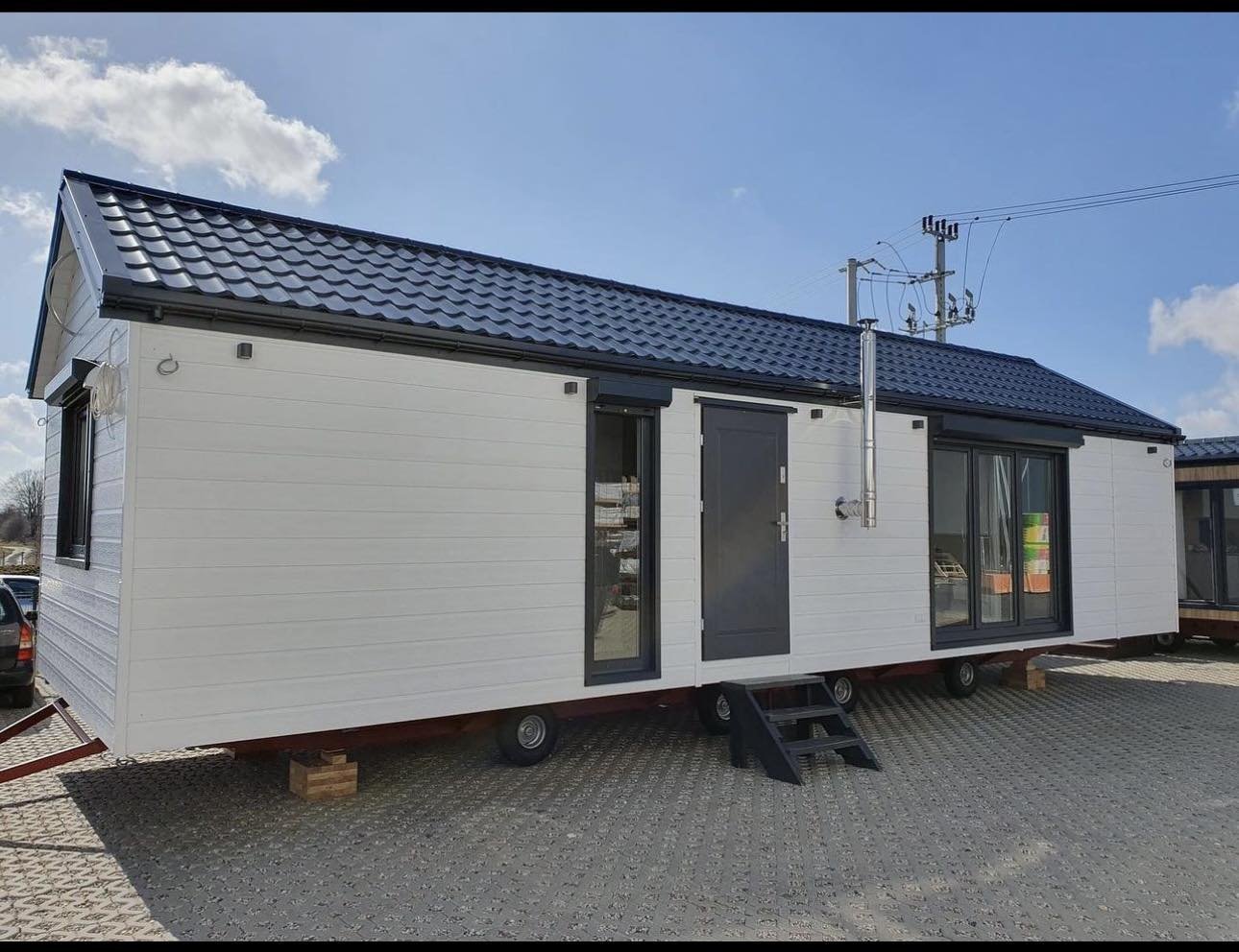 Luminosidade excecional e estilo contemporâneo. A Casa Móvel “Chalet Wood Gray” oferece uma área espaçosa de cerca de 40 m² caracterizada por um elegante revestimento exterior cinzento efeito madeira.