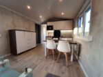 Os interiores são acabados com painéis cor “Cinzento Cimento” e pavimento em PVC resistente à abrasão, criando um ambiente moderno e luminoso graças à iluminação LED integral. A casa é autónoma e completa: desde o sistema hidráulico ao ar condicionado, até aos móveis feitos à medida incluídos no preço.