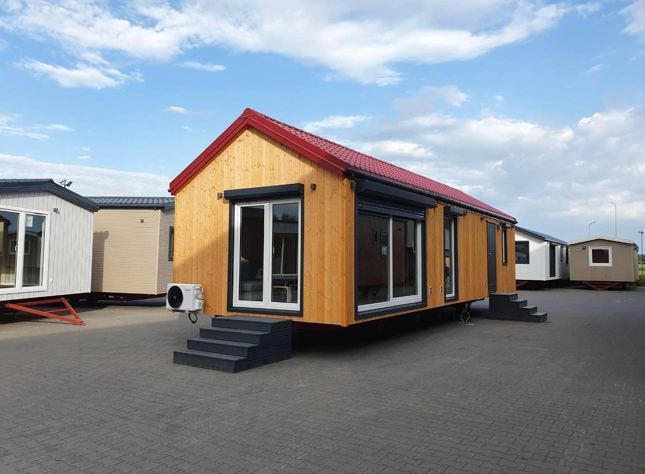 A casa móvel chega montada (transporte excecional). É necessário preparar uma base de apoio sólida (plataforma ou pilares) e as ligações às redes (elétrica, hídrica e de esgotos).