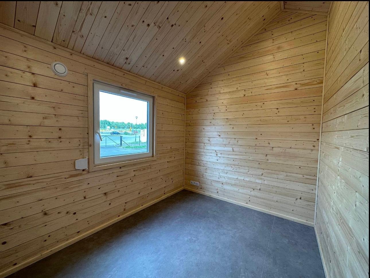 - Atmosfera Única: A mistura entre a madeira natural das paredes/teto e o mobiliário moderno cinzento/branco cria um ambiente luxuoso e acolhedor.