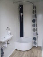 As paredes são constituídas por painéis sanduíche (tipo Obornickie) com 60 mm de espessura, que garantem isolamento térmico e facilidade de limpeza. O módulo chega “Chave na Mão”: o sistema hidráulico (tubos de esgoto de 110mm, água 3/4″) e o sistema elétrico (230V) já estão instalados. A água quente é garantida por um esquentador instantâneo estrategicamente posicionado.
