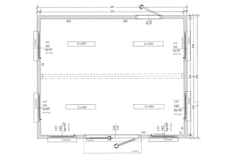 - Dimensões Internas: 5.75 m x 4.64 m x 2.50 m (Altura útil).