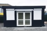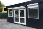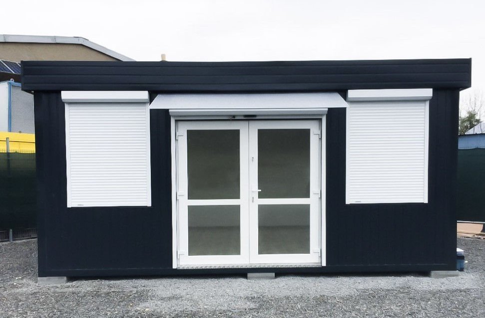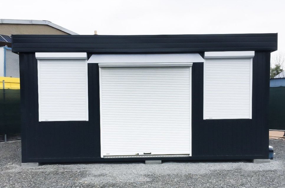 A qualidade construtiva é elevada: estrutura em aço galvanizado e isolamento em lã mineral prensada de 100 mm garantem durabilidade e conforto térmico em todas as estações. A segurança está em primeiro lugar graças aos 6 estores manuais e à porta de enrolar incluídos. O interior é acabado com pavimento em PVC efeito madeira reforçado (carga 200 kg/m²) e teto falso estético, pronto para receber clientes ou funcionários.