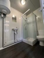 Organizzazione e privacy in 14 mq. Questo Modulo Prefabbricato offre una soluzione intelligente dividendo lo spazio in due aree distinte: un ampio ufficio/reception (ca. 9,5 m²) e una zona sanitaria separata (ca. 3,3 m²) con porta interna.