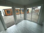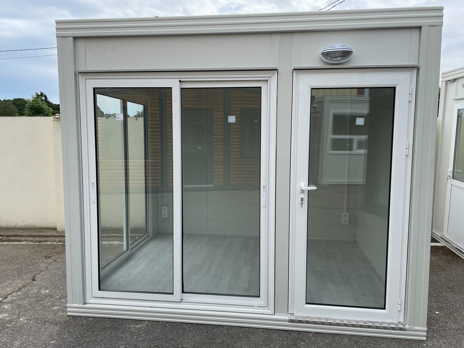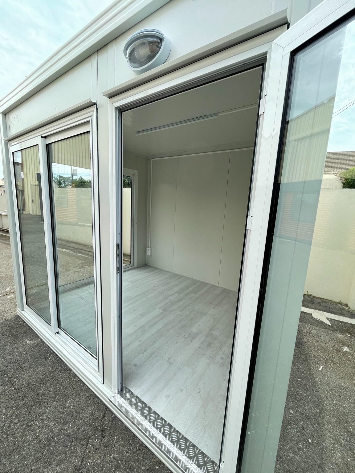 A estrutura é sólida e bem isolada: as paredes e o telhado são feitos de painéis sandwich com núcleo de espuma de poliuretano (40 mm), revestidos em chapa de aço pré-lacada branca. Isso garante resistência à humidade, isolamento do frio e uma manutenção praticamente inexistente ao longo do tempo. As caixilharias de alumínio com vidros duplos garantem ainda um bom isolamento acústico.