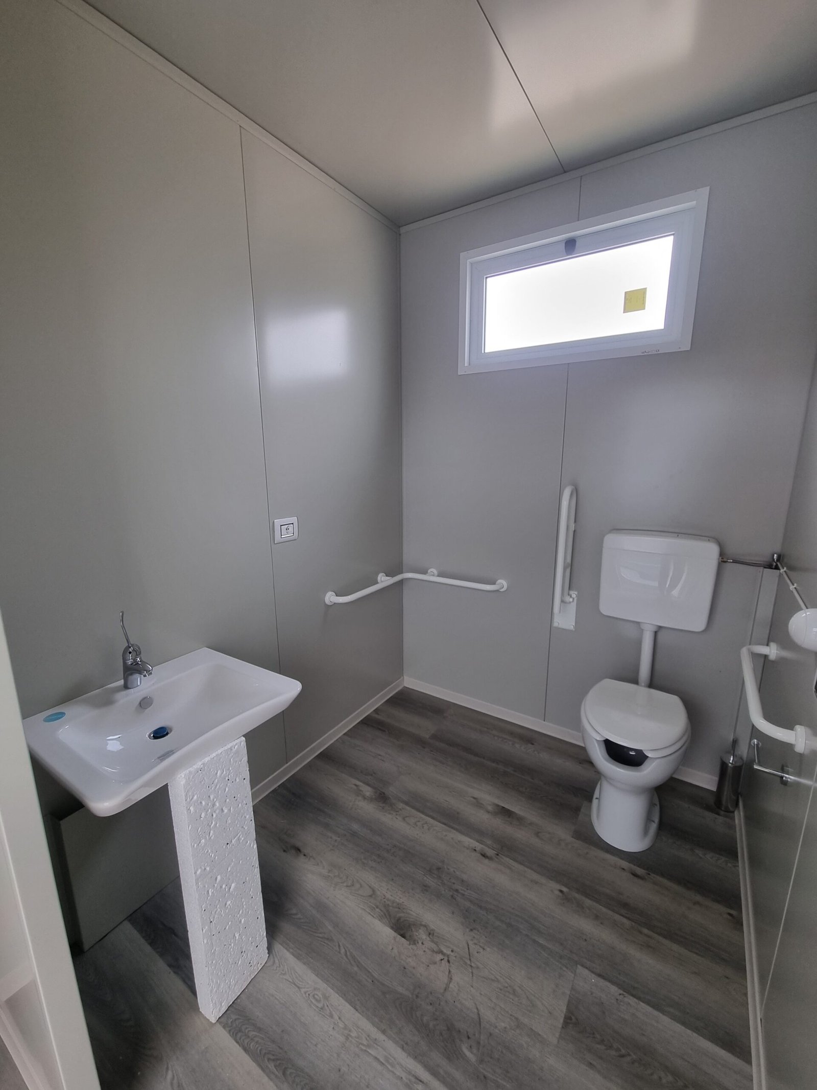 Monobloco de Serviços “Urban Prestige” 10x3m – Acabamento HPL e Telhado Duplo (Casas de Banho Múltiplas + Acessível)