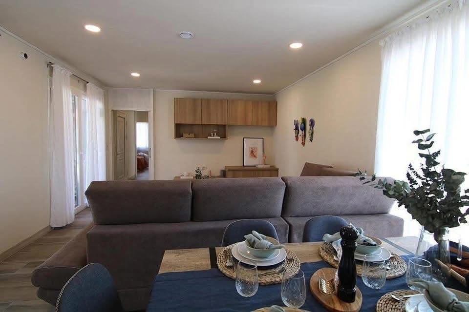 Destaca-se por um isolamento térmico excecional em poliuretano de 100 mm (superior aos padrões de construção) que garante eficiência energética e proteção total contra humidade e roedores. Dispõe de 2 quartos, sala de estar com cozinha e casa de banho completa. Entrega com descarga por grua incluída.
