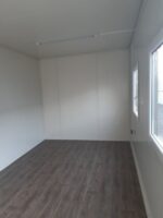 A estrutura oferece um conforto habitacional superior graças a dois fatores chave: a largura extra de 2,9 metros (que oferece muito mais espaço do que os 2,4m padrão) e o isolamento térmico de 100 mm. As paredes e o telhado em painéis sanduíche com núcleo de poliestireno garantem uma transmitância térmica de apenas 0,38 W/m²K, mantendo o ambiente quente no inverno e fresco no verão.