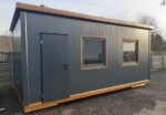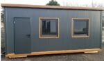 O Contentor de Escritório / Pavilhão de 17 m² da Brusato Container é a solução perfeita para quem procura um espaço de trabalho que combine funcionalidade técnica e impacto visual. Ao contrário dos monoblocos de estaleiro clássicos, este modelo possui um design contemporâneo, caracterizado pelo contraste entre o cinzento antracite das paredes e os elegantes acabamentos em cor de madeira nas caixilharias e nos rebordos.